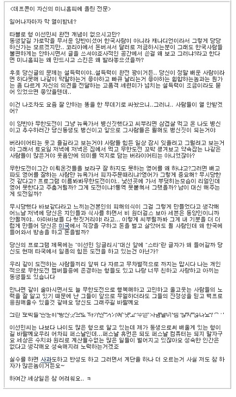 - 에픽하이의 멤버 타블로의 형 데이브가 무한도전 식객특집 뉴욕편에서의 일을 비난한 것에 대해서 자신의 개인 홈피에 이선민이라는 사람은 무개념인가?라는 제목으로 그를 까는 글을 올렸다. 데프콘의 글 전문