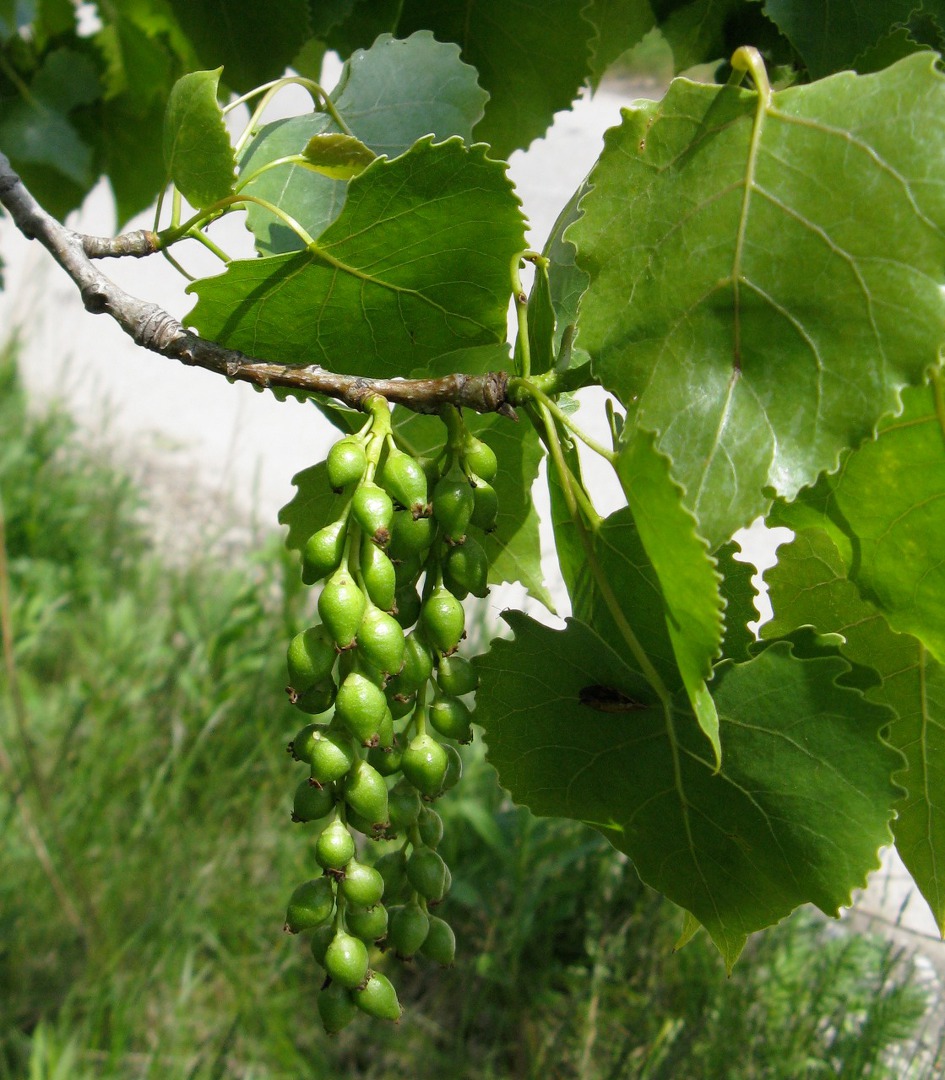 5~6월쯤 되면 15~30cm되는 삭과형 열매가 아래로 늘어진 이삭처럼 줄지어 자라난다. 미성숙한 열매의 각 개체는 덜 익은 꽃사과랑 은근히 유사한 난형의 형태를 취한다. 열매가 성숙하면서 갈라진 후 씨가 드러나는데, 이 씨들은 솜털로 덮여 있다.[3] 참고 그림.