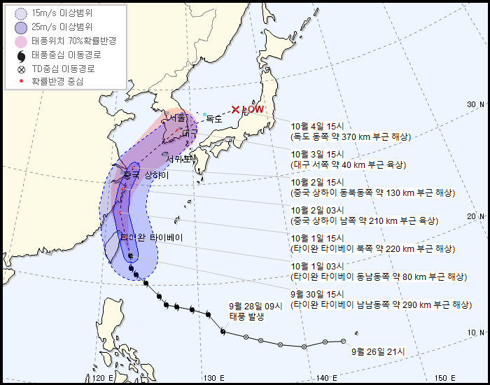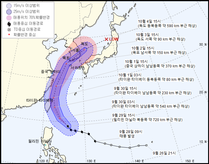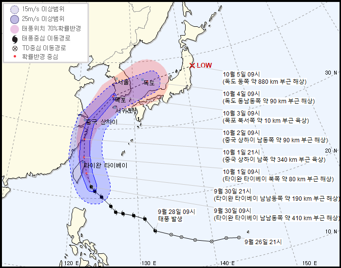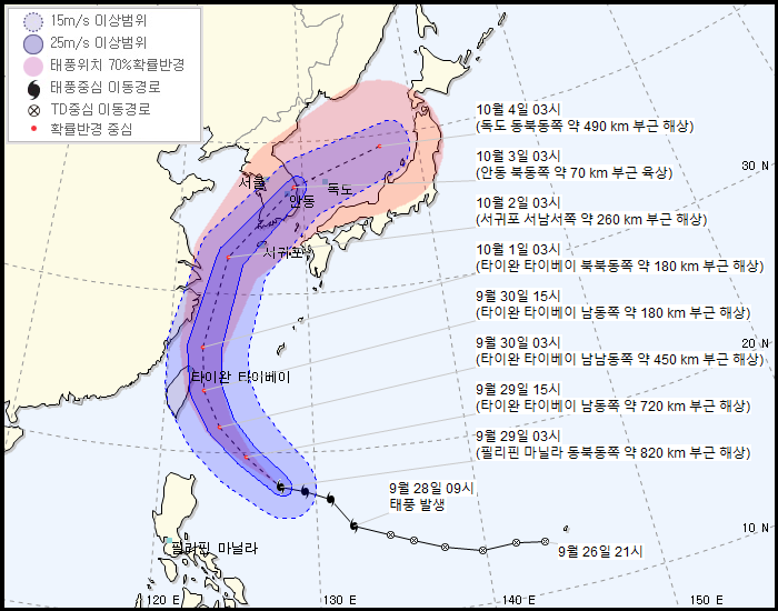 그리고 아직 태풍의 진로는 꽤나 유동적인 편이다.[4] 일부 진로도에서는 충남 서해안, 심지어 평택을 통해 수도권 일대를 관통하는 진로도 나오고 있다. 9월 30일이나 10월 1일은 되어야 어느 정도 태풍의 진로가 윤곽이 잡힐 것으로 보인다.