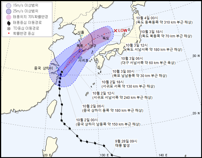 하지만 15시에 나온 새 진로도는 대폭 서편향 되면서 우리나라 기상청은 제주 관통 - 여수 상륙, 일본 기상청도 비슷한 경로로 제주도 옆을 스친 이후 여수-광양 근처 상륙을 예상하고 있다. 한반도 상륙 시기는 두 기관 공히 10월 2일 15시 경으로 보고 있으며, 세력도 두 기관 공히 970 hPa에 36 m/s로 보고 있다. 생각보다 서편향된 진로로 인해 지난번 타파보다는 조금 더 지켜봐야 하는 상황이 되었다. 대략 매미와 비슷한 진로이다.