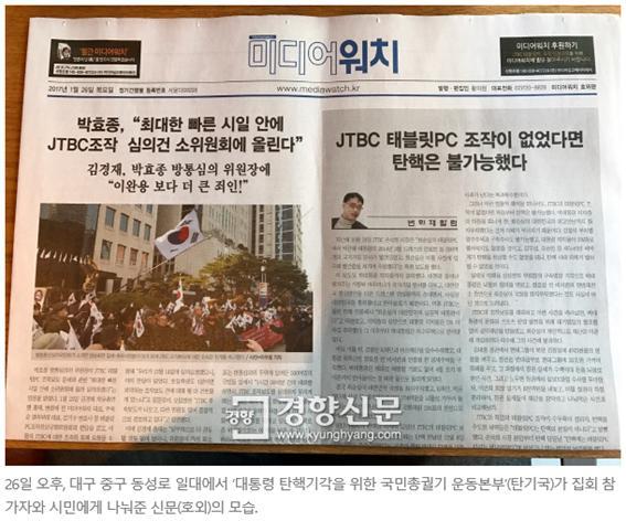 친박 집회를 옹호하던 미디어워치가 전경련에게서 과거에 지원금을 받았다는 사실이 jtbc 뉴스룸 보도로 인해 밝혀졌다.# 청와대가 전경련과 커넥션이 있었던 것이 확인되었으며, 미디어워치가 과거에 전경련으로부터 지원금을 받았고, 친박 집회를 독려하고 있고, 친박 집회에서는 조선일보 규모의 2배나 되는 300만 부의 탄핵 반대 가짜뉴스를 유인물 형태로 만들어 유포했다. 게다가 이 300만 부의 유인물을 미디어워치가 제작했다는 보도가 나왔다. # 조선일보의 하루 유/무료 발행 부수를 전부 합치면 154만 부 정도인데, JTBC 뉴스룸에서 밝히길 300만 부를 제작/유포하는 데는 최소 약 2억 원이 든다고 한다. #