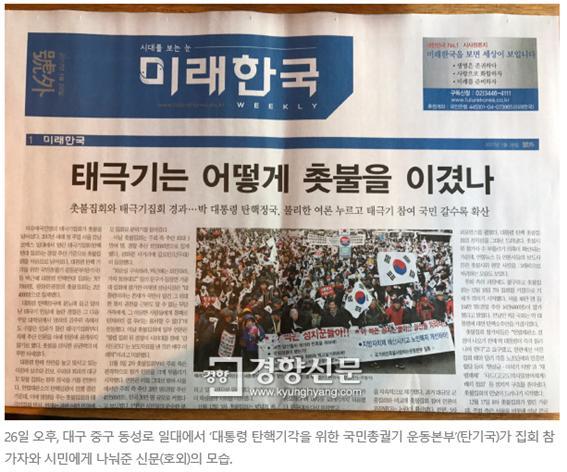 26일 서울역 광장에서 탄기국이 배포한 신문 <뉴스타운>이라고 써있다. 같은 날 대구에서는 <미래한국>이라고 써 있는 신문과, 미디어워치를 배포하였다. 박사모에서는 이 신문들을 '탄기국 신문'이라고 부르며, 딱히 '탄기국 신문'이라는 이름의 매체는 없으며 300만 부를 미디어워치 혼자 제작하기 보다 저런 식으로 분담해 맡는 듯 하다.