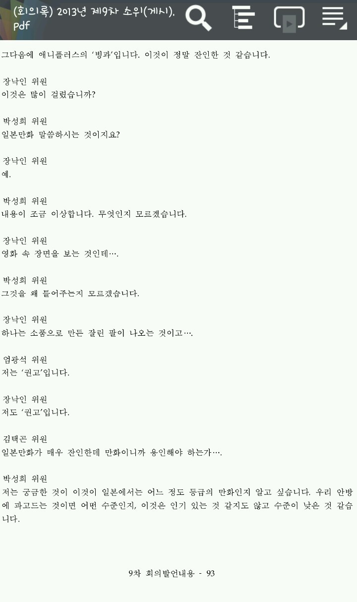 [1] 음란성은 심위기관 마다 다르다. 방심위는 음란한 것은 검열 및 차단에 힘을 쓰는 반면에 영등위는 범법행위만 아니면 등급을 분류해서 음란성을 판단하겠다는 것이고, 게등위는 음란한 것은 모두 19세로 올리되 19세인 경우 성기에 대한 직접적인 묘사와 직접적인 성행위가 아니라면 전부 허용하는 경우도 있다. 대표적인 예로 불렛 걸즈 판타지아가 있다.[2] 그런데 반드시 그렇지만도 않다. 가령 미국 대법원도 음란에 대해서는 명확한 규정을 두기 어려워, "I know when I see it" 이라고 설시한 판례도 있다. 음란에 대해서는 명확한 규정보다도, 무엇이 음란인고 무엇이 아닌지를 판별할 수 있게끔 법관들이 감을 잡을 수 있게 해 주는 선례의 축적이 필요하다고 보아야 할 것이다.[3] 현실 세계에 존재하는 실제 나이가 18세 미만인 모든 미성년자, 그림이나 소설 등의 묘사는 불법이 아니다.[4] 교육용은 상관없다.[5] 참고로 일본 법리상으로 항문은 성기가 아니므로 굳이 모자이크 처리를 하지 않아도 된다. 거기다 직접 노출해선 안된다고만 써있지, 정확한 비율이 명기되어 있는게 아니므로 모자이크의 강도는 점점 떨어지고 있다. 또한 실존하는 성기만 대상이기 때문에 딜도같은 조형물은 모자이크를 가하지 않아도 문제가 없다.[6] 결국 흐지부지 되었다... -[7] 심지어 2020년 한국에서는 배꼽을 노출하고 다니는 여성은 있지만, 상의를 탈의하고 돌아다니는 남성은 없다.[8] 미리 연령 통제가 가능한 극장과 달리 TV 같은 방송매체는 연령 통제가 몇몇 통제 기능이 달려있는 스마트 TV, 셋톱박스(그나마 있겠지만 해당 기능을 모르는 부모님들이 더 많다!)등을 제외하면 사실상 없는거나 다름없기 때문에 극장용 영화에 비하면 심의를 강화해서 할 수밖에 없다. 참고로 미국은 이런 기능이 있는 '''V칩'''을 모든 TV에 장착하는 것을 의무화시켰고, 일본의 경우에는 텔레비전 등급 제도가 아예 없다.[9] 단, 용의 콧물은 심의와 별개로 번역 담당의 장난질에 가까운 네이밍 센스 문제도 있다고 봐야 한다.[10] 미국의 방통위라 할 수 있지만 담당하는 분야가 훨씬 넓다.[11] 이 경우 '프로그램 관계자에 대한 징계', '해당(회차) 프로그램의 중지' 등의 징계를 함께 내릴 수 있다. '시청자에 대한 사과'는 헌법재판소의 위헌 판결로 폐지되었다.[12] 이는 같은 날 회의에서 심의 대상이 되었던 《논스톱 카툰》의 회의 내용과 대비되어 더 까였다. 아버지가 아들에게 전기충격기에 손발을 묶어 기절시키는 장면이 문제가 되었는데, 폭력성을 넘어 패륜적이기까지 한 것에 대해 김택곤 상임위원이란 인간이 한 말이 걸작이다.. 보면 안다. 위원장이란 인간도 별반 다르지 않다. 결과는 해당 방송 프로그램의 중지. 의결서는 같은 링크의 14~17p, 회의록은 같은 링크의 38~40p에서 볼 수 있다.[13] 사실 이런 회의 진행은 종종 벌어지는 일이고, 위원들끼리 의견 충돌로 말싸움을 벌여 보다 못한 위원장이 회의를 정회하는 일도 심심찮게 벌어진다.[스포일러] 이 장면은 고전부의 4명이 영화부의 자작 영화의 엔딩을 추리해내는 에피소드 중에서 영화내에서 영화부가 조잡하게 팔이 잘린 것처럼 팔 모양과 피 색깔의 액체를 뭍혀놓은 장면이다. 만약 이게 문제가 된다면 가짜 팔이나 인체소품들이 잘려있는 장면은 모두 심의에 걸린다는 소리가 된다. '''팔이 잘리는 장면도 아니다! 가짜 팔이 이미 잘려있는 장면이다!''' 한마디로 애니메이션의 한 장면만 보고 판단해버린 높으신 분들의 병크.[14] 다만, 위원들이 심의하는 안건이 한둘이 아니다 보니 실제로 위원들이 심의 과정에서 보는 영상은 사무처에서 문제되는 부분 앞뒤로 최대 5분 정도로 편집한 영상임을 감안해야 한다. 사무처의 센스 있는 영상 편집이 아쉬운 부분.[15] 다만, 단순히 동성간의 키스장면이라서 법정제재 '경고'로 의결된 것이라고 보면 곤란하다. '미성년자', '동성', '1분이라는 긴 시간', '클로즈업' 4가지 요소가 모두 합쳐져서 이런 불행한 결과가 나온 것이라고 이해하는 것이 정확하다.[16] 물론 실제로 잘리는 묘사는 없었지만.[17] 심지어 이건 '''7세 이상 시청가'''이다![18] 여담으로 북미판을 포함한 해당 판본을 사용하여 더빙된 언어의 판본에서는 해당 장면의 마술용 칼날이란 설정을 '에너지 디스크'로 바꾸고 화면 수정을 거쳐 더빙했다.[19] 사실 게임조차 딱히 인정하는 태도를 보이는 것은 아니다. 단지, 모바일게임을 통해 기성세대들에게도 게임이 친숙한 소재로 다가가기 시작한 데다가, 아시안게임에서 정식 종목으로 게임이 채택될 정도로 여론이 게임에 대해 호의적으로 바뀐만큼 꼰대질을 했다가는 '게임 산업 육성시킨다고 해놓고 게임을 죽여놓고 있냐' 며 여론의 뭇매를 맞게 되기 때문이다. 게임물관리위원회라는 자체적인 심사기관이 있는 것도 있고.[20] 유튜버,아프리카TV가 나와서 하는 영상 포함[21] 이는 애니메이션에 대해서는 일반 기성세대들의 시선이 아직까지 '애들이나 보는 것'에 머물러 있는 것이 이유기도 하다. 위에 언급된 게임의 경우는 기성세대들도 많이 즐기고, 여성들까지도 과거에 비해 자연스럽게 즐길 정도로 대중적인 문화컨텐츠로 