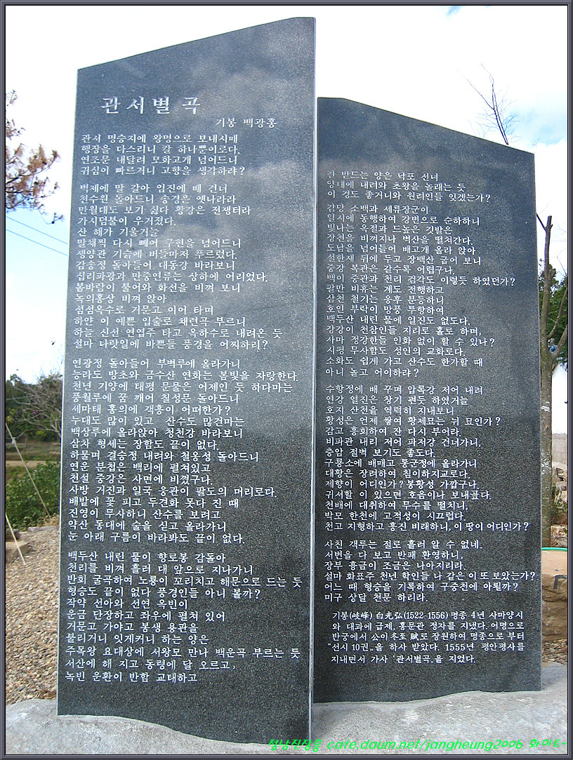 그가 1555년에 지은 「관서별곡」은 정철이 지은 가사 「관동별곡」보다 25년이나 앞서 지은 작품으로 기행가사의 효시가 된다. 은일가사(隱逸歌辭)→유배가사(流配歌辭)→기행가사(紀行歌辭)→내방가사(內房歌辭) 등등으로 맥을 잇는 ‘가사문단’에서 그 위상이 특별하다. 조선조 이후 모든 기행문학의 모체로까지 전해진다.