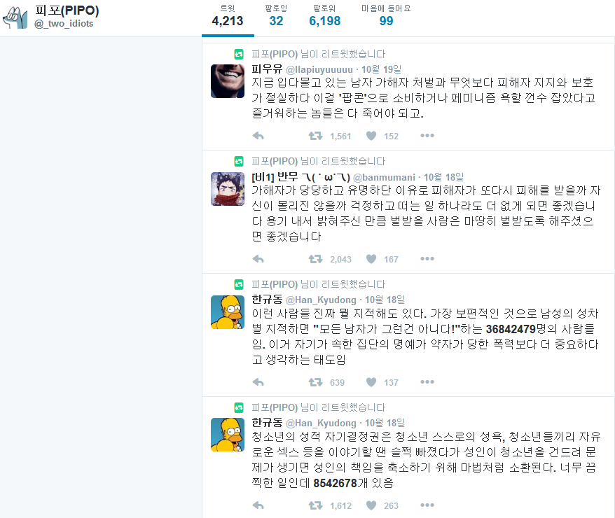 - PIPO 작가는 이 사건에서 문제가 된 성우를 옹호했던 작가들 중 한 명이다. 캡쳐. 자기가 직접 멘션을 짠 문제 발언들 아카이브 1, 2. 아카이브된 시기를 보면 알겠지만 2016년 9월이 될 때까지 어떤 해명도 보이지 않고, 멘션도 당당하게 계속 남기고 있다. 그렇다고 관련 사항을 더이상 언급하지 않는 걸 보면, 삭제라도 해서 자기가 진 것 같이 빼게 되긴 싫지만 욕 먹기도 싫으니 그냥 자기가 한 발언들이 묻혀 지나가길 기다리는 듯하다. 실제로 처음 아카이브에 실린 "해당 사항을 전부 다 알아보고 보이콧을 선언하는 거냐?"는 요지의 글에도 현재까지 묵묵부답이다. 본인이 정말 당당하다고 여겼다면, 시비성도 아닌 저런 진지한 질문을 굳이 무시할 이유가 없다. 이후로는 별 행보 없이 조용한 듯 싶었으나, 이 사건이 터지자 얌전하게 피해자를 위로하는 트윗들만 리트윗하는가 싶더니 고새 이런 소리를 끼워 넣었다. 해당 리트윗 전문까지 포함한 당시의 아카이브. 이로 보아 그 뒤로도 딱히 생각을 바꾸거나 반성을 한 건 아닌 걸로 보인다.
