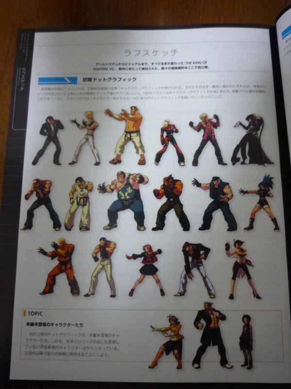 결국 다음작인 KOF XIII에서는 허벅지 굵기와 얼굴 표정이 살짝 보정되어서 예전작들과 비슷한 분위기로 바뀌었다. 하지만 바뀐건 일러스트뿐이고 도트는 그대로라 허벅지가 굵다. 아래처럼 다른 모션을 보더라도 허리폭과 하체의 비율이 확실히 어색하다. 그래도 움직임이 많은 대전 게임인지라 실전에서는 크게 신경쓰이지는 않는다.