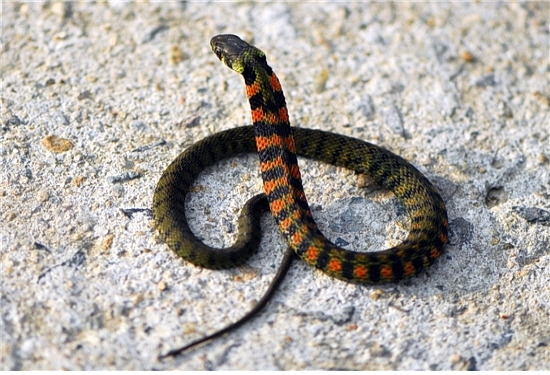 특이한 사실은 용혈독을 사용하는 독 외에도 수동적 방어수단으로 별도의 독을 사용한다는 것이다. 위협을 받으면 목을 넓게 펼쳐 위협하면서 공격을 그 방향으로 유도하기도 하는데 이부분에 추가적인 독주머니를 가지고 있으며 이 부분을 공격받으면 피부가 찢어지며 독이 외부로 흘러나온다. 여기서 나오는 독은 두꺼비를 섭취하면서 저장해 둔 두꺼비독인 부포톡신.목을 부풀리고 머리를 치켜드는 위협자세를 보면 마치 코브라 같다.[5] 일단 꽤 오랫동안 독이 없다 알려졌기 때문에 지금도 종종 독이 없다고 적힌 책 등을 볼 수 있다. 생각보다 위험한 동물. 그런데 위기탈출 넘버원에서는 독이 없다는 잘못된 정보를 내보냈다.[6] 선글라스 벗어도 죽고 웃어도 죽는다는 프로그램에서 정작 독사에게 독이 없다고 방송한 것은 역시 아이러니. 게다가 이 독은 쇠살무사나 까치살무사보다 더 강력하다고 하며, 국내에는 해독제도 없다.