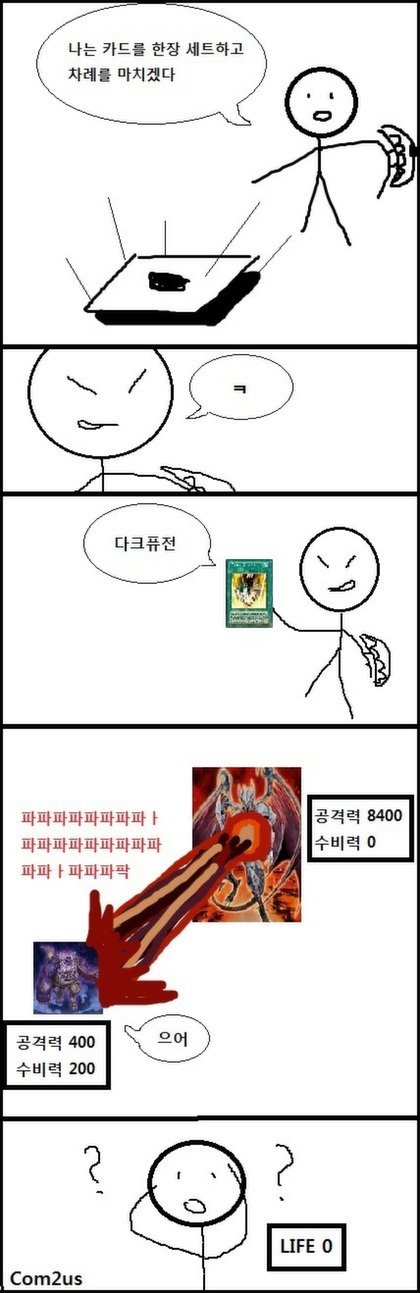 한국의 한 유희왕 온라인 유저의 만화로, 게임 내 싱글 이벤트에서 종횡무진했던 다크 가이아 원턴킬 덱을 풍자한 것이다. 결국 이 카드는 2010년 하반기부터 2012년 유희왕 온라인의 서비스가 종료될 때까지 '''금지''' 자리를 굳게 지켰다. 다만 1가지 오류가 있다면, 거대화를 쓰지 않는 이상 저 시점에서 공격력 8400은 못 만든다. 이 카드의 높은 공격력으로 LP 8000을 단번에 깎아버려 원턴킬이 난다는 걸 보여주기 위해 적당히 지은 수치.