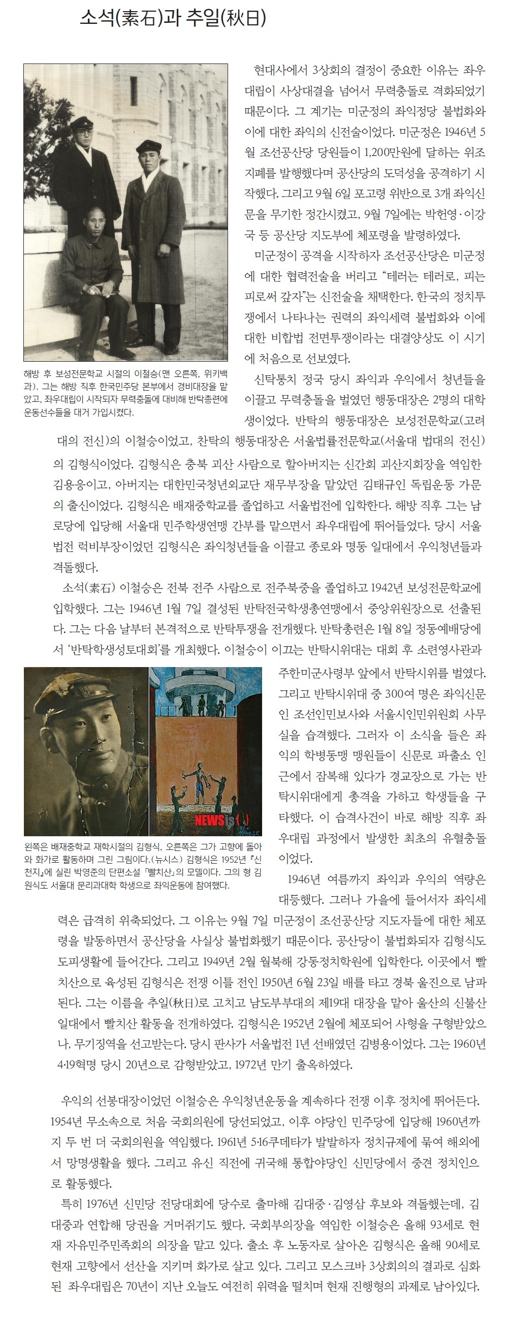 [1] 본가가 전북 전주 지역 유지였으며 본인도 전주에서 학교를 나왔기에 전주 출신으로 본다.[2] 대사성공파 32세손 승(承)자 항렬을 쓴다. [3] 이 장면은 야인시대에서도 나오는데 개헌안이 날치기로 통과되자 최순주를 향해 " 야! 최순주! 이 나쁜 놈아! " 라고 소리치며 단상에 달려나와 멱살을 잡는 장면이 나온다.[4] 이철승은 철저한 극우 반공주의 성향의 인물이었기 때문에 기본적으로 국가보안법에 대하여 존치론을 강력히 주장하는 인물들 가운데 한 명이었다. (#) [5] 1년 뒤에 5.16 군사정변이 일어나면서 그들은 모두 부정부패 정치인으로 낙인 찍혀 모두가 구속당한다. 이철승의 이때 발언이 실로 ㅎㄷㄷ한 예언이었던 것이다.[6] 40대 기수론은 이철승과 김영삼이 주장해 유진산의 퇴진을 요구한 데서 시작했고 김대중은 뒤에 합류했다. 유진산은 이철승이 김영삼을 밀어주는 조건으로 이것을 받아들여 불출마했다.[7] 이철승의 딸 이양희가 김진만의 차남 김택기와 한 때 부부였다가 이혼하였다.[8] 당시 서울대학교 사회과학대학 외교학과 교수 노재봉이 이를 제안하였다고 한다. 노재봉은 훗날 노태우 정권에서 대통령 비서실장을 지냈으며, 이후 관변 활동을 계속 하고 있다.[9] 당시 정권의 탄압 때문에 제도권 정치에서 밀려나 있던 김대중은 이철승의 타협적인 태도를 보고, 자신의 측근들한테 어떻게든 김영삼을 지원해서 신민당 대표 경선에서 승리할 수 있게 하라고 지시했다.[10] 1997~1998년 MBC 경찰청 사람들에서 자주 출연했던 연극배우 출신.[11] 전주[12] 전주 을[13] 전주, 완주[14] 한국국민당과 신설 합당
