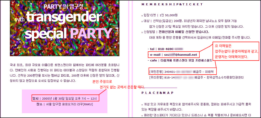 - 태국 은둔시기라 말하는 시점에 한국에서 거주하며 주최한 트랜스젠더 파티 안내장 - 자세히 보면 한국 은행계좌, 전화번호 사용을 하며 진행 하였음을 알 수 있다.