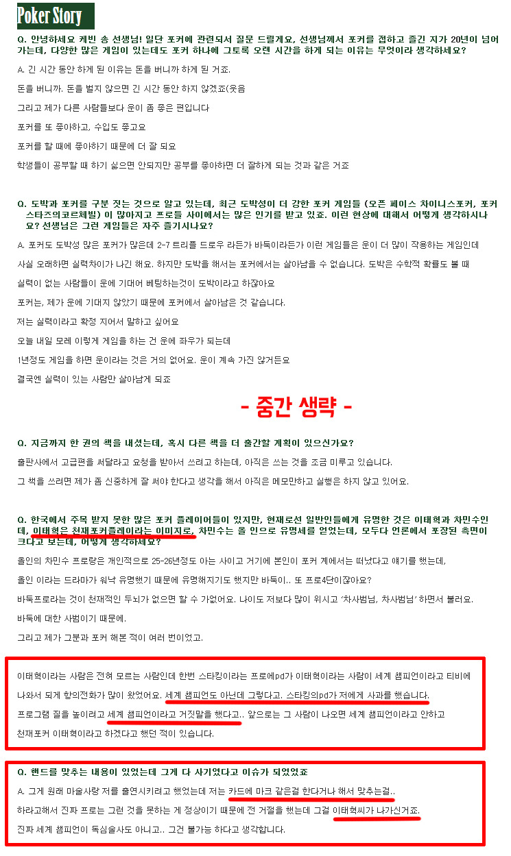 아래 링크는 차민수와 더불어 포커계의 유명 겜블러인 케빈송의 홀덤클럽 공식 인터뷰 내용이다. 스타킹의 PD가 그를 세계 챔피언으로 띄워준 것은 거짓말이었다고.#1, #2