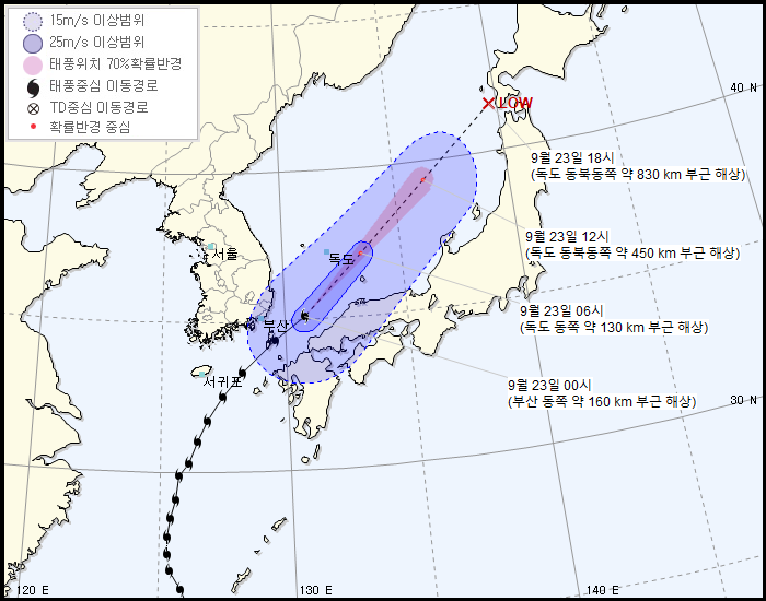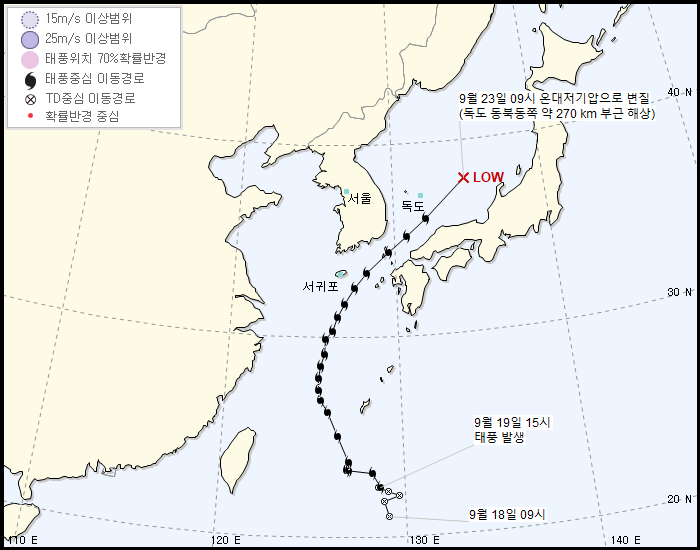 9월 23일 오전 1시 기준 이동경로 대한해협을 통과한 이후 동해상에서 빠른 속도로 북동진하며 온대저기압화가 진행되었고, 9월 23일 오전 9시에 대한민국 경상북도 울릉군 독도 동북동쪽 약 270km 부근 해상에서 중심기압 992hPa의 온대저기압으로 변질되면서 일본 기상청과 한국 기상청 모두 공식 예보가 종료되었다.