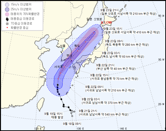 9월 20일 오후 5시 기준 세기에 비해 비구름이 크게 발달한 물폭탄형 스타일의 태풍이 되었다.[3] 기상청에서 "최대 고비는 22일 오전부터 23일 새벽이 될 것"이라고 밝혔다. #1 #2 오후 10시 기준 이동경로 21일과 22일 부산지역에 직접 영향을 미칠 것이라는 예보에 따라 이번 주말 개최키로 한 광안대교 보행행사 등이 취소되거나 개최장소를 변경하는 등 비상 조치에 돌입했다. #