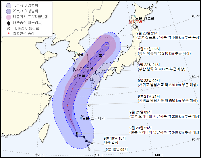 경로가 동북편항되어서 대한해협으로 바뀌었다. 필리핀, 대만, 베트남이 아니라 한국, 일본이 영향권에 들어가게 되었다.