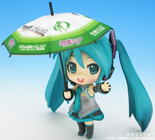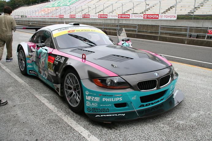 2008년 8월에 일본 Super GT라는 레이스 대회에 Studie GLAD with ASADA Racing Team이 하츠네 미쿠의 씰을 부착하고 출전했다. 이유는 굿스마일 컴퍼니가 스폰서로 참여하고 크립톤사가 이 팀에 협찬으로 캐릭터 지원을 했기 때문. 참고로 경주차는 BMW Z4(M Coupe Motorsport Version). 2009년에 약간 디자인을 바꿨긴 했지만 그래도 미쿠가 붙어있었다. 심지어 레이싱 모델들도 하츠네 미쿠의 코스프레를 했다. 대회 출전을 기념하기 위해서인지 넨도로이드에 레이싱 모델들이 썼던 파라솔 버전도 있다. 이 팀은 '레이싱 미쿠'라는 독자적인 바리에이션의 미쿠를 사용한다. 레이싱 모델이라는 독특한 느낌 때문에 상당히 인기 있는 바리에이션. 굿스마일 레이싱이라는 자회사에서 출전이나 우승 등의 행사가 있을 때마다 기념 피규어가 발매되어 덕후들의 돈을 걷어가는 걸로 유명. 매년 대회에 출전할 때마다 레이싱 미쿠의 코스튬도 새로 그려진다.