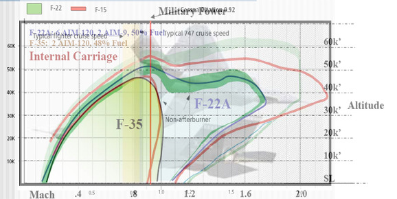 하지만 모든 실전무장을 기체내부에 탑재하도록 설계된 F-22나 F-35는 클린상태의 기동성이 실전상태의 기동성과 더욱 비슷하다는 말이 된다. 즉 단순히 저런 식의 그래프나 도표상으로 보여지는 차이보다 실전에서는 기동성 면에서 더욱 큰 격차가 벌어진다는 뜻.