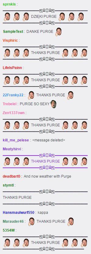 게임 캐스터 퍼지는 오랫만에 말쑥하게 차려입고 게임을 분석하는 전문적인 모습을 선보이며 그동안 폐인 같은 몰골로 개인 스트림을 하던 이미지에서 벗어났다. 터치 스크린을 이용한 분석 장면이 어찌나 전문적으로 보였는지 그가 등장할 때마다 트위치 채팅창은 "THANKS PURGE"*로 도배되는 밈이 생겼고, "기상캐스터 같다."는 얘기가 퍼지자 대회 4일차 땐 정말로 기상 정보를 안내하기도 했다. 물론 개드립으로 가득한 안내였다. 기상캐스터 퍼지