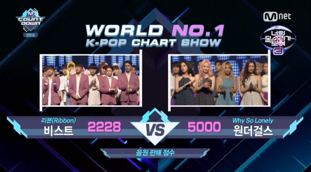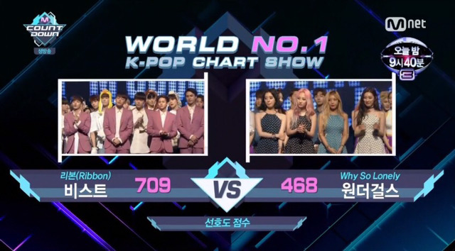- 이틀 뒤, 엠카운트다운에선 비스트와 1위 후보에 올랐는데 역시 1위에 성공했다. 특이한 점은 이 날 비스트는 음원 점수 외에 다른 점수들이 원더걸스보다 높아도 애초에 1위를 할 수 없었는데 그 이유는 원더걸스의 음원 점수가 만점이었기 때문.[12][13] 이로써 선미는 8년 만에 엠카운트다운에서 1위를 했다.[14]
