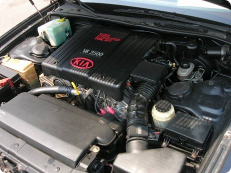 엔진은 V6 2.5[8], 3.0, 3.6 엔진까지 총 3종이 존재했다. 1997년 출시 당시 국내 최대 승용차 배기량[9]을 기록했던 3.6리터 엔진은 포텐샤부터 쓰던 마쓰다의 3리터급 V6 JE-ZE 엔진의 배기량을 기아자동차에서 자체적으로 확대시킨 것으로, 3.6리터라는 숫자는 당시 경쟁 모델의 배기량이 3.5리터였던 점을 다분히 의식한 숫자였다. 변속기는 3가지 엔진 모두 4단 자동변속기가 맞물렸다. 최고 모델인 3.6리터 엔진의 출력은 당시 기준 230마력, 여기에 최고속도 역시 230km/h이다.